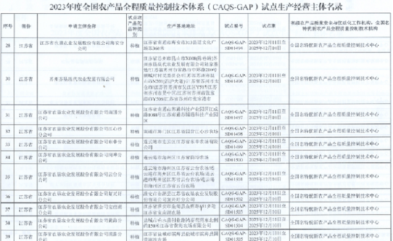 近日,農(nóng)業(yè)農(nóng)村部農(nóng)產(chǎn)品質(zhì)量安全中心公布2023年度全國農(nóng)產(chǎn)品全程質(zhì)量控制技術(shù)體系(CAQS-GAP)試點生產(chǎn)經(jīng)營主體名錄,蘇墾農(nóng)發(fā)旗下19家分公司和子公司蘇州蘇墾現(xiàn)代農(nóng)業(yè)發(fā)展有限公司均榜上有名。