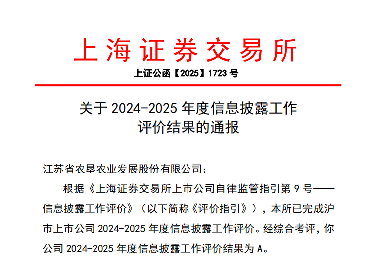 近日,上海證券交易所公布滬市主板上市公司2024-2025年度信息披露工作評價結果,蘇墾農(nóng)發(fā)(股票代碼:601952)再次獲評最高等級“A”級。至此,公司已連續(xù)六年蟬聯(lián)上交所信息披露最高評級。