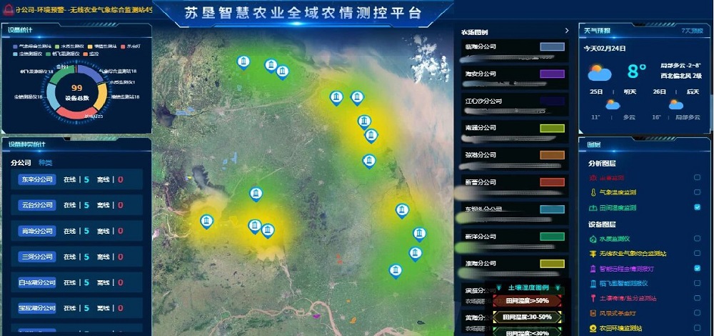 圍繞保障糧食安全核心功能,由公司黨委抓總、總部科技信息部負責(zé)總體架構(gòu),集成應(yīng)用低空農(nóng)業(yè)、無人化裝備、人工智能技術(shù),搭建智慧農(nóng)業(yè)“一張圖”“一片云”“一張網(wǎng)”共性平臺,開發(fā)應(yīng)用無人值守巡田系統(tǒng)、全域“四情”監(jiān)測系統(tǒng)、智慧灌溉系統(tǒng),推廣精準變量施肥、衛(wèi)星平整地、北斗輔助駕駛技術(shù)裝備,多維度提升農(nóng)業(yè)生產(chǎn)效率與管理水平,輸出江蘇農(nóng)墾智慧農(nóng)業(yè)集成解決方案。