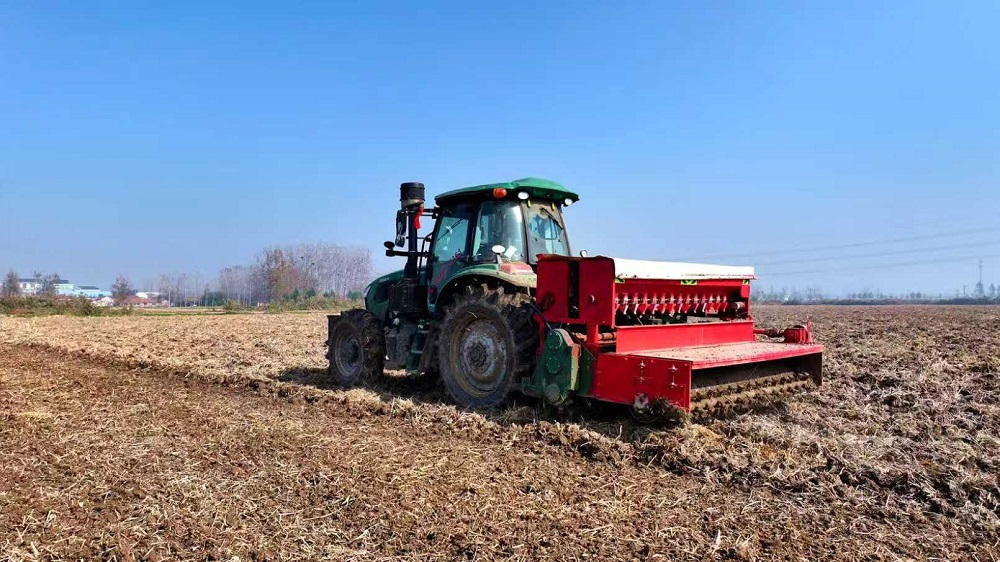 精細(xì)化管理是今年秋播工作的又一亮點(diǎn)。各外拓基地根據(jù)當(dāng)?shù)貙?shí)際情況,制定了詳細(xì)的秋播技術(shù)方案和田間管理預(yù)案?;剞k全體人員分區(qū)包干,駐點(diǎn)跟蹤服務(wù),對(duì)整地質(zhì)量、播種深度、密度和施肥量等進(jìn)行專項(xiàng)督查指導(dǎo),做到“一區(qū)一策”,實(shí)現(xiàn)精準(zhǔn)化管理。同時(shí),加強(qiáng)土壤墑情監(jiān)測(cè),密切關(guān)注天氣變化,及時(shí)做好抗旱防澇準(zhǔn)備,確保秋播小麥在最佳環(huán)境下生長(zhǎng)。此外,充分發(fā)揮現(xiàn)代農(nóng)業(yè)機(jī)械化優(yōu)勢(shì),外聯(lián)大批先進(jìn)、智能的農(nóng)業(yè)機(jī)械參與秋播作業(yè)。根據(jù)今年土壤墑情,選擇小履帶拖拉機(jī)進(jìn)行開(kāi)溝作業(yè),安裝了北斗導(dǎo)航系統(tǒng)的智能化播種機(jī)實(shí)現(xiàn)直線播種、播深一致,不僅大幅提升了作業(yè)效率和質(zhì)量,也為后續(xù)的田間管理和機(jī)械化收獲創(chuàng)造了有利條件。